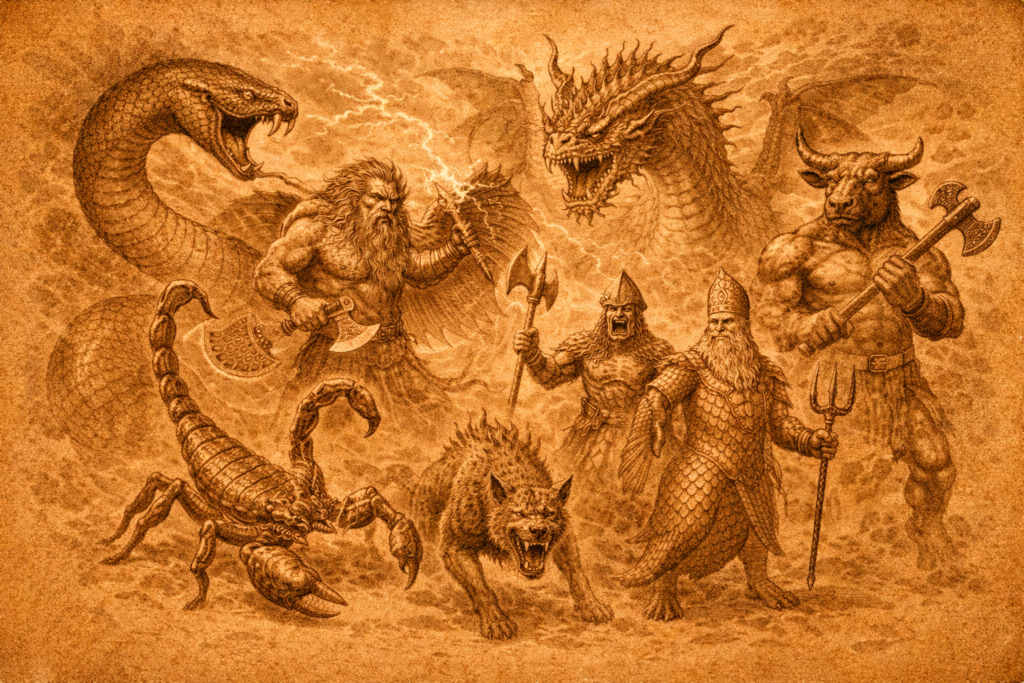 古代バビロニア神話における「最初期のモンスター軍団」とも呼ばれ、後世のドラゴン・キメラ・魔王軍の原型と考えられています。